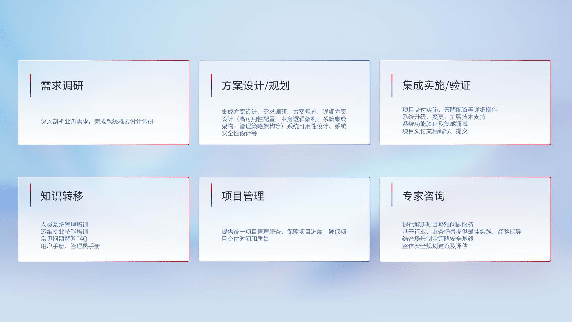 针对客户行业特性,,,将宏观的安全战略和需求,,,,通过专业的交付服务,,,实现项目落地,,为客户提供标准规范的集成交付服务。。。